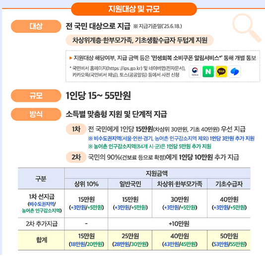 1차 소비쿠폰 지급은 전 국민을 대상으로 하되, 기초생활수급자와 차상위계층, 한부모 가족 등 취약계층에는 더 많은 지원금이 주어지는 방식입니다. 전 국민은 1인당 15만 원을 기본으로 지급받고, 기초생활수급자는 40만 원, 차상위계층과 한부모 가족은 각각 30만 원을 지급받습니다. 이는 소비 진작뿐 아니라 직접적인 소득 보전 효과도 가져올 수 있습니다.