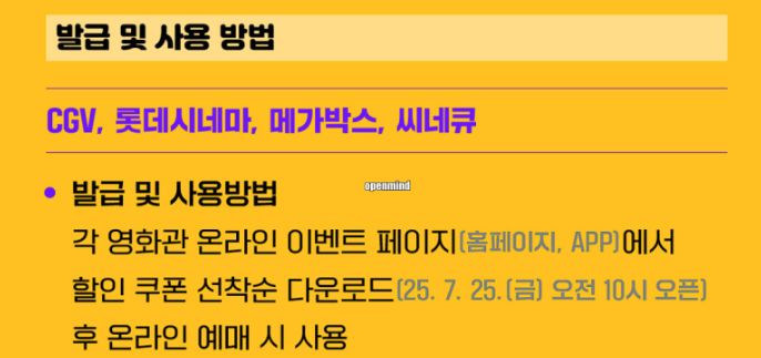 할인권은 CGV, 롯데시네마, 메가박스 등 주요 영화관 홈페이지와 앱에서 7월 25일 오전 10시부터 선착순으로 받을 수 있으며, 사용 기한은 9월 2일까지입니다. 멀티플렉스뿐만 아니라 독립영화관, 실버영화관 등 다양한 상영관에서도 사용 가능하고, 할인권은 기존 할인과도 중복 적용됩니다.