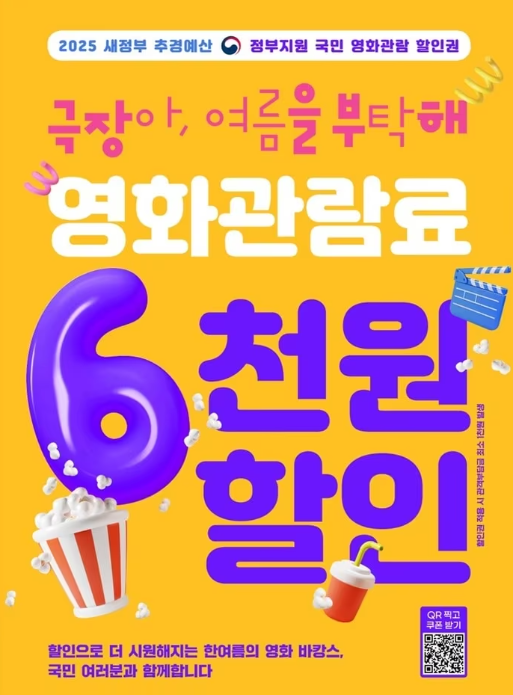 정부는 내수 진작과 영화산업 활성화를 위해 2025년 2차 추가경정예산 271억 원을 투입하여 영화관 입장권 6,000원 할인권을 총 450만 장 배포한다고 밝혔습니다.